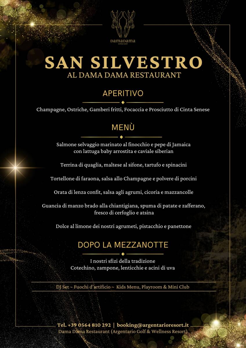- Cena di San Silvestro al Dama Dama Restaurant (bevande escluse) con intrattenimento musicale DJ set e fuochi d’artificio con vista sul nostro campo da golf – VEDI IL MENU’.